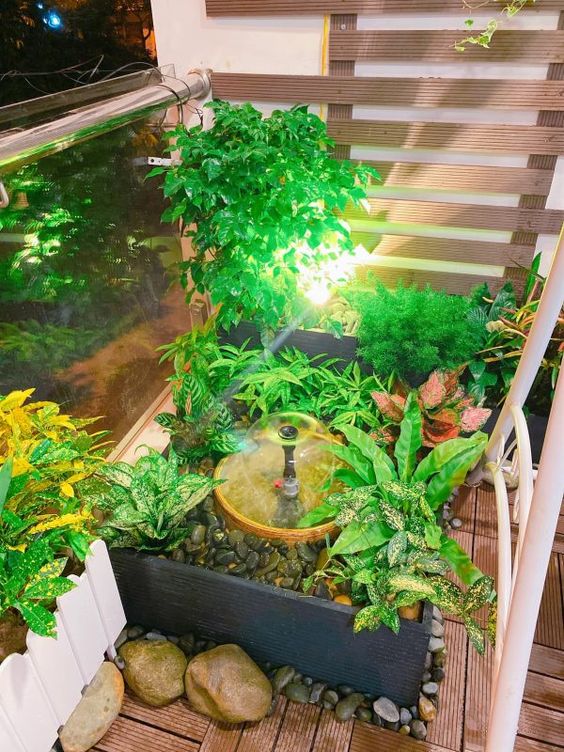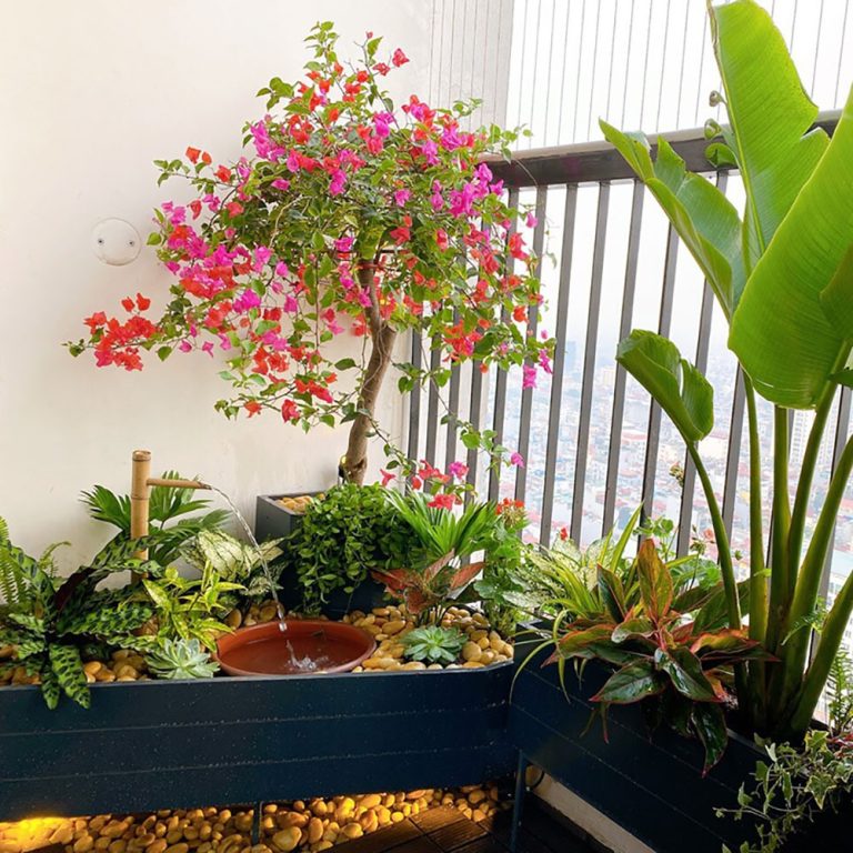 Tiểu cảnh ban công với cây xanh, thác nước...