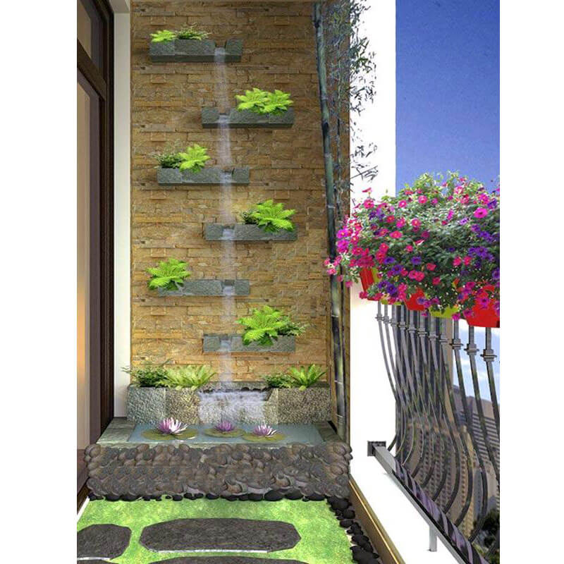 Khu vực ban công sẽ trở nên vô cùng cuốn hút, đẹp, lãng mạn, yên bình và tràn đầy sức sống khi xuất hiện cây xanh, thác nước... Biến góc ban công vốn khô khan, ảm đạm, không có chút thẩm mỹ nào trở nên độc đáo, ấn tượng, giúp cho không gian sống trong lành và mát mẻ hơn.